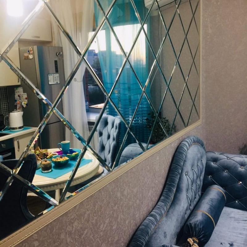 Использована серебристая квадратная зеркальная плитка размером 18х18.