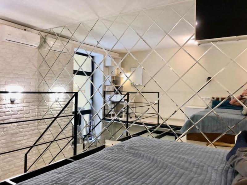 Использована серебристая квадратная зеркальная плитка размером 18х18.